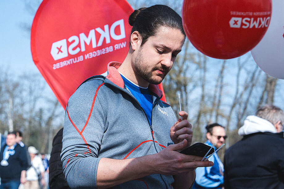 Pünktlich zur Stadionöffnung standen Mitarbeiterinnen und Mitarbeiter des Karlsruher SC und der DKMS gemeinsam mit der Unterstützung der Supporters Karlsruhe bereit. An drei Ständen beantworteten sie bis zum Anpfiff Fragen, sammelten Spenden und registrierten Menschen als mögliche Stammzellspenderinnen und -spender von Morgen. Insgesamt kamen dabei über 200 neue Registrierungen zusammen.