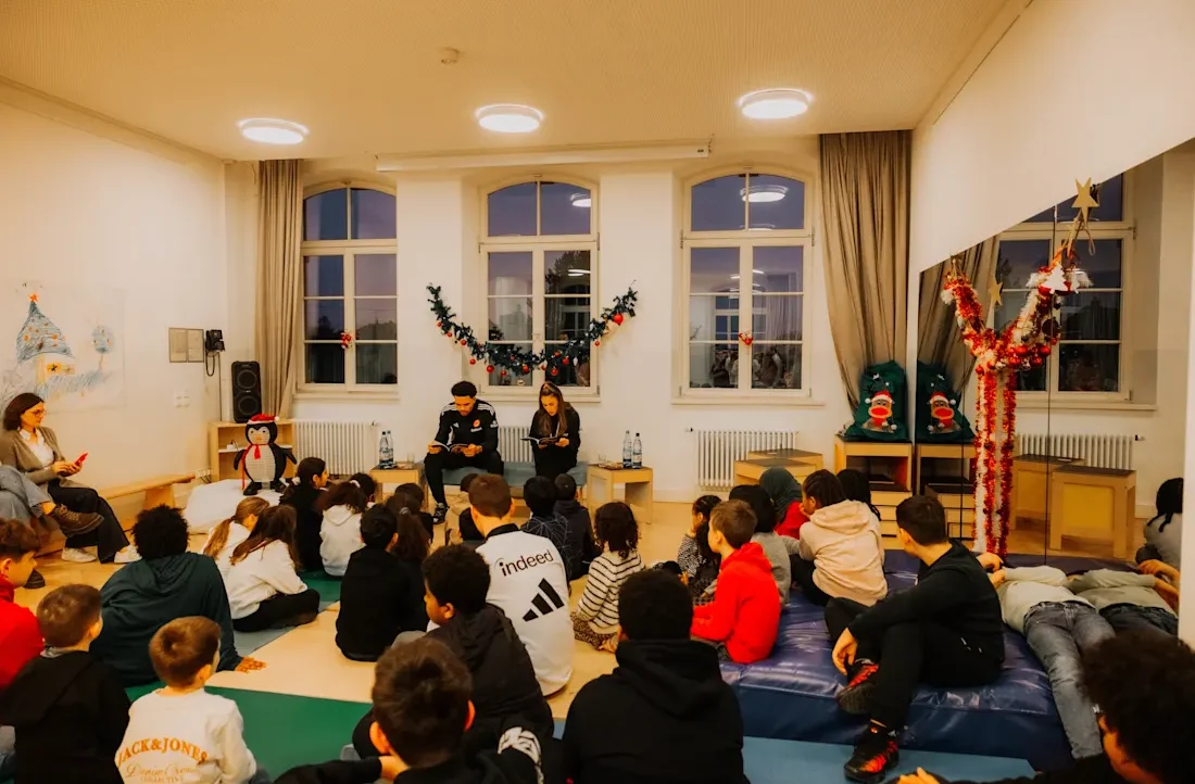 Nach einer kurzen Begrüßung durch Stadionsprecher Daniel Wolf und der Vorstellung der Spielerinnen und Spieler begann ein lebhafter Nachmittag für mehr als 50 Kinder im Alter von sieben bis 14 Jahren, die in zwei Gruppen der Eintracht-Weihnachtsgeschichte lauschten.