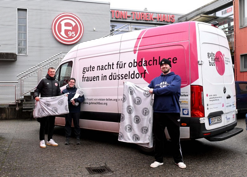 Über den Winter gab es in den Fanshops zu diesem Zweck eine besondere Aktion. Für jede gekaufte Decke wurde eine weitere gespendet. Dabei kamen 141 Decken zusammen, die nun von der Fortuna-Legende Oliver Fink an den gutenachtbus übergeben wurden.