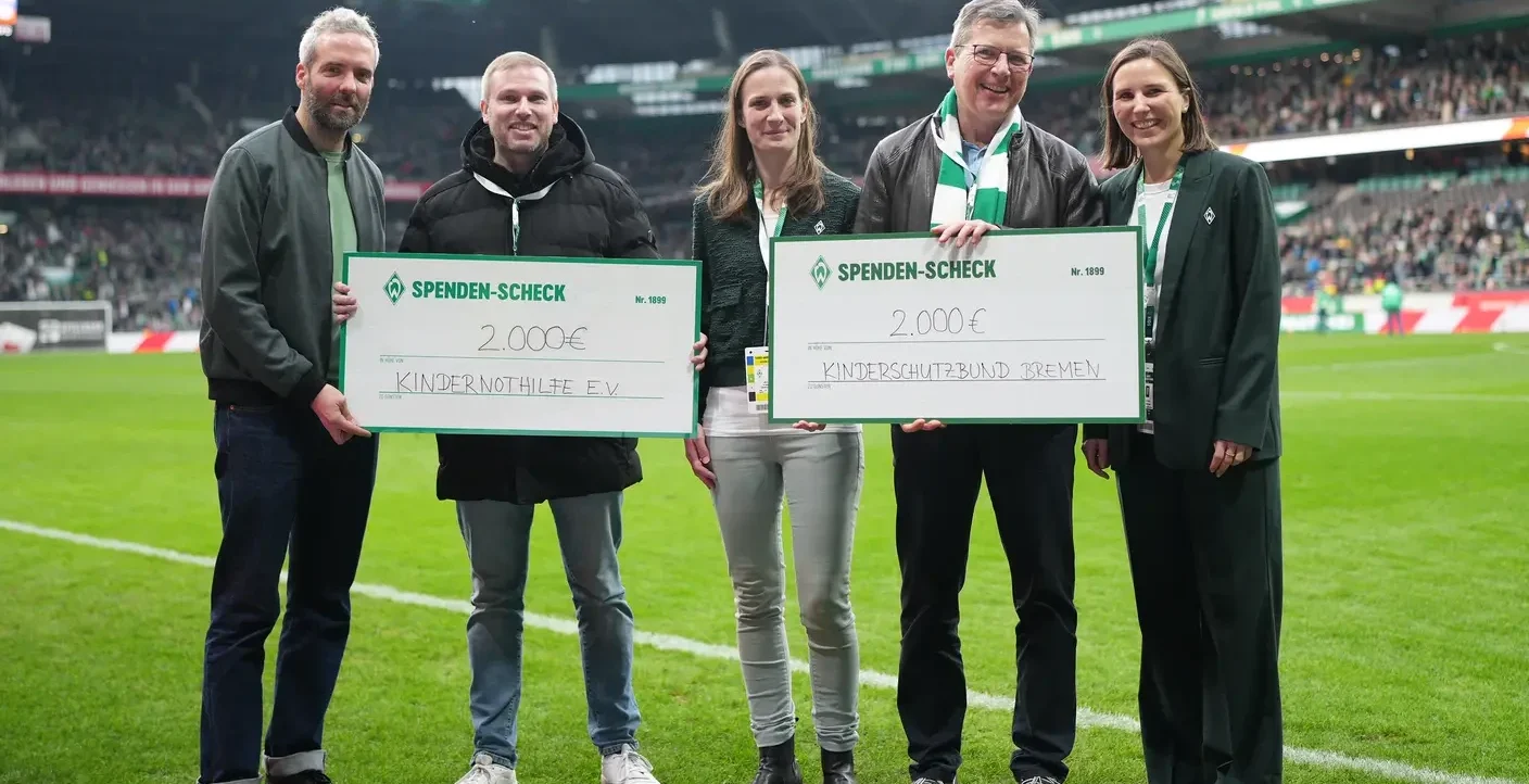 Durch die Versteigerung der Warm-up-Shirts der Profi-Teams und den Verkauf des Aktionsshirts „Klare kante für Kinderrechte“ kamen insgesamt 4.000 Euro zusammen. Die Erlöse aus der SV Werder Bremen Stiftung wurden im Rahmen des gestrigen Bundesliga-Heimspiels der Herren gegen den 1. FC Heidenheim (2:0) offiziell übergeben. Jeweils 2.000 Euro gehen an den Kinderschutzbund Bremen und an Kindernothilfe e.V..